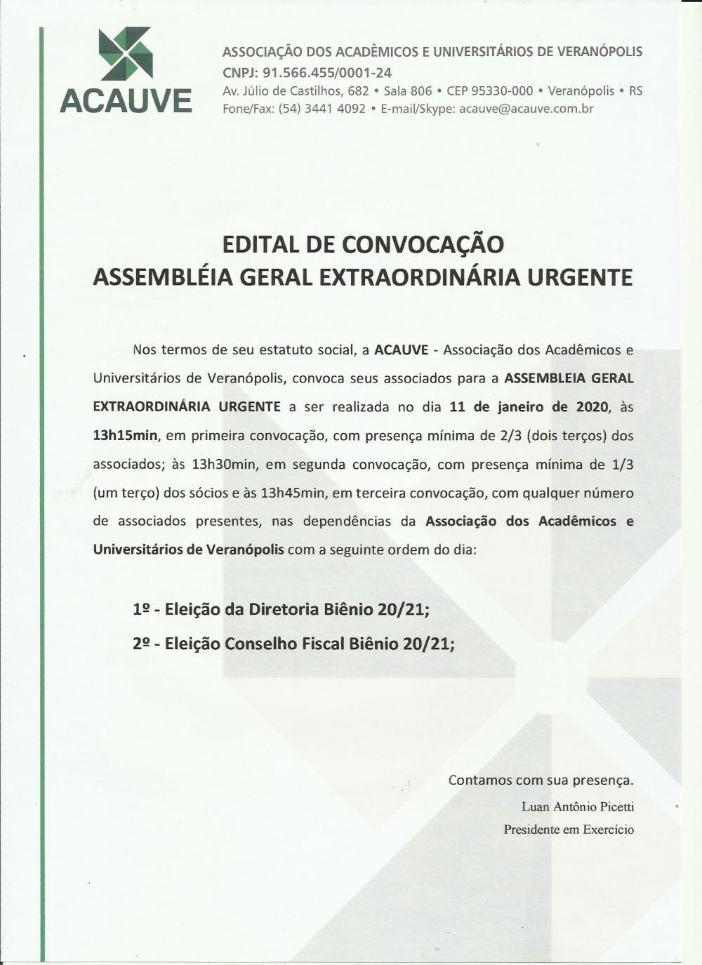 Convocação!!! Solicitamos a presença de todos na sede da associação neste sábado dia 11/01/2020. É de extrema importância a participação de todos.