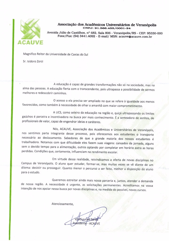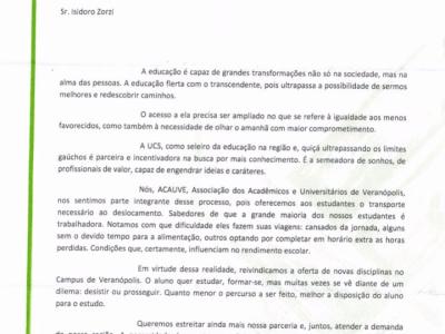 A Diretoria envia carta em apoio a disponibilidade de disciplinas isoladas para o Núcleo de Veranópolis.