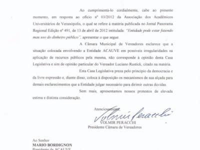 Frente a publicação de uma vereador junto a contra capa do Jornal Panorama Regional, a ACAUVE encaqminhou ofício a Câmara Municipal de Veranópolis e obteve a resposta em anexo.