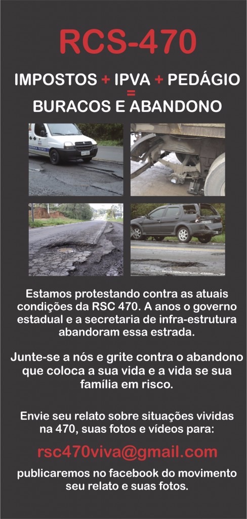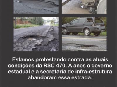 Pessoal. Este é um protesto apartidário promovido por cidadãos Veranenses com o intuito de chamar a atenção da sociedade para as precárias condições da RSC 470, principalmente no trecho entre Bento Gonçalves e Veranópolis.