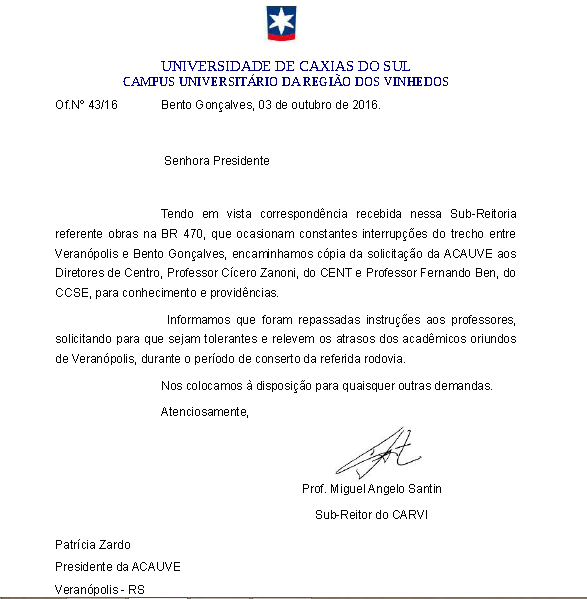 Em virtude das obras de recuperação da rodovia BR 470, a direção da ACAUVE encaminhou no mês que se passou uma correspondência a Universidade de Caxias do Sul.